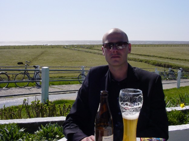 Tjitse Hofman keurt het bier op het terras van Hotel Hel te Epibreren.