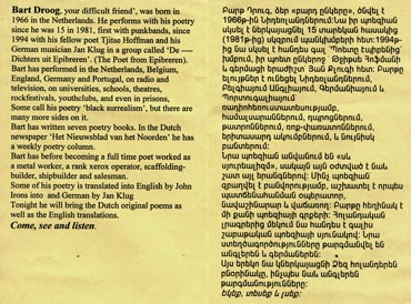 Op 30 april 2000 vertrok de dichter Bart FM Droog voor 7 dagen naar Armenië in de Trans-Kaukasus, waar hij enkele Nederlands- en Engelstalige voordrachten zal verzorgen, o.a. in de Jazz Club te Jerevan. Tevens zal Droog Armeense dichters en literaire organisaties pogen te ontdekken teneinde literaire banden tussen Armenië en Nederland te leggen.