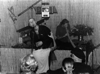 "Je hebt er niet meteen een boterham aan", zegt de zorgvuldig kaal geschoren, geheel in het zwart gestoken dichter, "maar het ontwikkelt zich wel. in het begin waren we blij dat we ergens konden optreden, nu moeten zij blij zijn. Anders komen we niet. Uiteindelijk doe je het omdat het in je zit. voor mij is het een verslaving en dé manier om zielenroerselen kwijt te raken."
