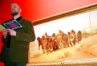 ![]() Voor het boek Dichters over Repin heeft hij een gedicht gemaakt bij Ilja Repins bekendste werk 'De Wolgaslepers', dat normaliter in het Russisch Museum te Sint Petersburg hangt. ![]() In het Groninger Museum declameerde hij tijdens de Poëziemarathon 2002 dat gedicht bij het schilderij (foto © Henk Veenstra). Zie www.google.com voor meer over Sergej Gandlevskij. © Irina Michajlova en Bart FM Droog, december 2001 |