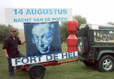 de lokale copyshop toch klantvriendelijkere prijzen. JACOB VAN LENNEP EN OVERIJSSEL Zwolle/Epibreren - In Dagblad de Stentor kijkt Paul Gellings uitvoerig terug op het verblijf van de onlangs overleden dichter Jacob van Lennep (1802-1868) in Overijssel. (Rottend Staal Online, 16-7-2004) terug naar boven HEYTZE HUISDICHTER UTRECHTS NIEUWSBLAD Utrecht/Epibreren - Vanaf vandaag is op elke vrijdag een actualiteitsvers van onze medewerker Ingmar Heytze in het Utrechts Nieuwsblad te lezen. In een interview met die krant zegt hij daarover: 'Ik wil met poëzie het nieuws van de week van een andere laag voorzien. Je kunt met een gedicht laten zien wat het allemaal zou kunnen gaan betekenen.' Heytze vindt dat de aanleidingen voor zijn gedichten in de krant zelf te lezen moeten zijn geweest. 'En het is een uitdaging. Ik kan niet dagenlang schaven, maar ik moet gewoon elke week op tijd inleveren. Als je over vijftig jaar een serie van deze gedichten leest, zou je een aparte kijk op deze rare stad met die wonderlijke mensen moeten krijgen.' Zijn eerste gedicht in de serie is opgedragen aan de Utrechtse dichter Alain Teister (1932-1979) en is getiteld 'Utrecht aan zee'. Heytze is hiermee niet de eerste huisdichter van een krant: elke zaterdag is in het Dagblad van het Noorden een vers vers van Driek van Wissen te lezen, Daan de Ligt dicht regelmatig in de Haagsche Courant en in 1999 dichtte onze medewerker Gerrit Komrij wekelijks in het Algemeen Dagblad. (Rottend Staal Online, 16-7-2004) terug naar boven NIEUWE WIGMAN IN AANTOCHT Amsterdam. Onze medewerker Menno Wigman is druk doende de laatste hand te leggen aan zijn nieuwe bundel, die als alles goed gaat in oktober verschijnt. De titel zal naar aller waarschijnlijkheid Dit is mijn dag worden, naar de gelijknamige titel van het bekende gedicht dat op zijn huispagina prijkt. (Rottend Staal Online, 16-7-2004) terug naar boven HET GROTE ALFRED SCHAFFER-INTERVIEW Epibreren - In de Vrij Nederland van deze week is een buitengemeen openhartig en fraai interview met onze medewerker Alfred Schaffer te lezen. De interviewster is Elisabeth Lockhorn. die we al kennen van eerdere dichtersinterviews. (Rottend Staal Online, 16-7-2004) terug naar boven DICHTER AAN DE SNELWEG ![]() © Eva Salomons, 2004 Willemstad - Onze medewerker Simon Vinkenoog nodigt schilderijgewijs automobilisten op de A29 (Rotterdam-Bergen op Zoom) uit om op 14 augustus de Nacht van de Poëzie in Fort de Hel bij te wonen. De maker van het schilderij is Frank Kastelein, kunstenaar en kasteelheer van het Napoleontische fort nabij Willemstad. (Rottend Staal Online, 15-7-2004) terug naar boven DE RESIDENTIE DOET ZOMERFESTIVALS Amsterdam - Onze medewerkers van De Residentie doen deze zomer een groot aantal zomerfestivals aan. Zo staan ze op de openingsavond van Landjuweel te Ruigoord (29 juli tot en met 2 augustus) geprogrammeerd, op Dichters in de Prinsentuin (29 en 30 juli) te Groningen, op het Open Haven Festival te Amsterdam (20 tot en met 22 augustus) en op het literair popfestival Zoem zoem zoem... in het Vlaamse Herentals, op 21 augustus. (Rottend Staal Online, 15-7-2004) terug naar boven WALGELIJKE DICHTVERKRACHTING Epibreren - Vaak vraagt de redactie zich af waarom dichters, songtekstschrijvers en prozaisten niet met hun gore klauwen van prachtwerk van een ander afblijven. Het resultaat is namelijk altijd minder dan het origineel en het ergste is wel dat door dit soort gefröbel het publiek ernstig misleid wordt. Zo vergreep Freek de Jonge zich een aantal jaren geleden aan Bob Dylans prachttekst 'Death is not the end' en maakte daarvan de carnavalskraker 'Na de dood', waarop de domme Hollanders massaal hosten zonder te weten dat de muziek en de tekst van het origineel wezenlijk beter klinken. En momenteel heeft een Nederlandse popzanger een zomerhitje met een fluttekst op een prachtmelodie van The Doors - de naam van die zanger is ons gelukkig onbekend, de melodie die hij misbruikt is van 'People are strange'. We zouden ons er niet aan storen, ware het niet dat we naar die kul moéten luisteren, omdat nieuwszender Radio 1 die rotzooi uitzendt en mevrouw Van Dalsum de hele redactie dwingt mogelijk poëzienieuws op die zender te monitoren. Maar ook in de dichtkunst blijft deze onnutte spielerei met andermans werk populair - en we vragen ons af waarom. Zo attendeerde onze medewerker Hanz Mirck ons op zijn weblog www.hanzmirck.web-log.nl, waarop naast onthullingen over de ware identiteit(en) van de mysterieuze Yusef el Halal een eerbetoonverwijzing naar werk van een uwer redacteuren te lezen zou zijn. De schrik sloeg ons om het hart toen we dat 'tribuut' lazen. Van wat het is - een beschrijving van een voor drie personen historische autorit, waarin na elke zuippartij ordentelijk geslapen werd om daarna nuchter verder te rijden naar het volgende optreden - is nu een doelloze autoreis gemaakt waarin enkel gezopen en gereden wordt, in slecht Nederlands. Walgelijk. (Rottend Staal Online, 15-7-2004) terug naar boven ALLE DHC-RAPPERS VRIJ Den Haag (ANP) - De raadkamer van de rechtbank in Den Haag heeft ook de derde rapper van DHC (Den Haag Connection) op vrije voeten gesteld. Dat zei persofficier van justitie A. Rijsdorp woensdag. De man wordt ervan verdacht dat hij Tweede-Kamerlid Hirsi Ali (VVD) in een rap met de dood heeft bedreigd. Twee medeverdachten kwamen al eerder vrij. De verdenking van bedreiging blijft staan, aldus de persofficier. De politie pakte de drie leden van DHC op 2 en 3 juli op. Enkele dagen daarvoor had Hirsi Ali aangifte gedaan van de bedreigingen. In de songtekst staat onder meer dat een liquidatie van de VVD-politica in voorbereiding is. Verder wordt ze flink uitgescholden. Het Openbaar Ministerie heeft het onderzoek naar de bedreiging nog niet afgerond. Het kan zijn dat de mannen worden vervolgd voor een 'gewone' bedreiging en voor het belemmeren van een parlementariër in het uitoefenen van haar taak. Voor de derde verdachte geldt ook een verdenking van drugsbezit. De raad