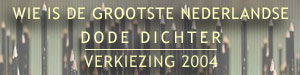 Staal Online, 17-8-2004) DEELDER, VAN DOORN EN VAANDRAGER BIJ FOKAS HOLTHUIS Amsterdam - Antiquariaat Fokas Holthuis bericht in haar recentste nieuwsbrief over de prachtige collectie boeken, manuscripten, foto's en platen van J.A. Deelder, Johnny van Doorn en C.B. Vaandrager. Op zondag 22 augustus zijn deze producten tussen 10.00 en 17.00 uur ook verkrijgbaar op de boekenmarkt langs de Amstel, in stand 76 bij het tijdelijk café naast het Stadhuis in Amsterdam. (Rottend Staal Online, 17-8-2004) terug naar boven PARK & POËZIE 2004: DICHTERS NATUURLIJK! Middelburg - Op zondag 12 september 2004, van 13.00 tot 18.00 uur, treden nationale en internationale dichters op in de historische binnenstad van Middelburg. De Stichting Park & Poëzie presenteert dit jaar, in samenwerking met de Zeeuwse Bibliotheek, de eerste editie van haar gelijknamige evenement. In achttien speciaal opengestelde tuinen in Middelburg wordt poëzie voorgedragen door de volgende dichters: Jana Beranová, Carla Bogaards, Anneke Brassinga, Emma Crebolder, Al Galidi, Jo Govaerts, Sylvia Hubers, Marcel Koopman, Marie-Cécile Moerdijk, Anneke Schenk, Patty Scholten, Albertina Soepboer, Erik Spinoy, Hans Tentije, Jan Kees van de Werk en Titi Zaadnoordijk. In een speciale kindertuin (toegang gratis) wordt werk van Annie M.G. Schmidt voorgelezen. De bekende Duitse acteur Rufus Wagner draagt werk voor van onder andere Goethe, Heine en Rilke in de Duitse tuin, de binnentuin van Galerie T (toegang gratis). De optredens van de dichters worden afgewisseld met levende muziek, onder andere verzorgd door Erik van den Berge, de winnaar singer-songwriterwedstrijd van de Zeeuwse Belofte 2004, een klezmergroep en harpisten. Tot en met zaterdag 25 september is in het Zeeuws Documentatiecentrum van de Zeeuwse Bibliotheek in Middelburg nog de tentoonstelling Park & Poëzie. Dichters Natuurlijk! te zien. De kaartverkoop start woensdag 18 augustus bij de Stichting Theater Exploitatie Zeeland en via de klantenservice van de Zeeuwse Bibliotheek te Middelburg. De kaarten kosten €7,50 per stuk, inclusief de samengestelde bundel met niet eerder gepubliceerd werk. (Rottend Staal Online, 17-8-2004) terug naar boven WAAR BLIJVEN DIE ACHT STEMMERS? Epibreren - Onze medewerker Quirien van Haelen mag dan een 9 behaald hebben, wij zijn dringend op zoek naar 8. Acht lezers wel te verstaan, die zich dringend moeten uitspreken over wie hun populairste poëzierecensent is. Zoals we gisteren al aankondigden is het uitbrengen van een stem niet langer een daad van vrijwilligheid, maar vanaf nu een verplichting. Lezers die nog niet gestemd hebben mogen niet verder lezen en worden vriendelijk verzocht het Rottend Staal-nieuws te mijden tot na de sluiting van de stemming, aanstaande vrijdag. Onze lezer Gerard Beentjes uit het Amsterdamse was de laatste die nog vrijwillig heeft gestemd. Liesbeth van Dalsum vroeg hem op wie. Gerard Beentjes: 'Op Guus Middag: ik lees zijn stukken over poëzie gewoon graag.' Van Dalsum: 'En je hebt ook een stem uitgebracht op de minst capabele. Wie is dat volgens jou?' Beentjes: 'De minste vind ik Ilja Leonard Pfeijffer: te eenzijdig, buiten zijn eigen tuintje groeien er geen bloemen.' Van Dalsum: 'En hoe omschrijf je binnen de poëziewereld je zijn?' Beentjes: 'Simon Vinkenoog stelde mij ooit voor aan publiek als 'poëziefacilitator'.Ik ben docent schrijven, bestuurslid en organisator van de Poëzieslag in Festina Lente, en dichter.' (Rottend Staal Online, 17-8-2004) terug naar boven JOHN COOPER CLARKE TE ANTWERPEN Antwerpen - Vorige week trad in het kader van Antwerpen Wereldboekenhoofdstad 2004 de legendarische Britse dichter John Cooper Clarke op. Onze medewerker Andy Fierens was erbij en nu onze sterverslaggeefster Liesbeth van Dalsum toch al aan het rondvliegen was besloot ze ook bij hem te landen. Liesbeth van Dalsum: 'Lieve Andy, hoe was het?' Andy Fierens: 'Vijftien jaar heroïnegebruik heeft zijn sporen wel nagelaten, dat is wel het minste dat je kan zeggen over JCC. Maar hij zal me vooral bijblijven als een echte superkerel - wat is die man lief, echt waar. Het optreden was chaotisch maar het publiek was er gek op. Ik heb drie dagen met hem opgetrokken en heb me geen minuut verveeld. Van Dalsum: 'Dit klinkt of je een affaire met hem begonnen bent. Dat is toch niet het geval?' Fierens: 'Hij heeft me wel gevraagd om met hem mee naar Londen te gaan, maar dat mocht ik niet van mijn hoogzwangere vriendin An.' Van Dalsum: 'Gelukkig, ik maakte me al zorgen. Heb je nog verder iets te melden over JCC?' Fierens: 'Er wordt veel over hem gelachen, omdat hij een has been en een junk zou zijn, maar ik vond hem in de eerste plaats een zeer intelligent man die naast een schuine mop hier en daar heel veel te vertellen had zowel op het vlak van film en literatuur als op het politieke vlak.' (Rottend Staal Online, 17-8-2004) terug naar boven EEN 9 VOOR QUIRIEN VAN HAELEN Haelen - Onze medewerker Quirien van Haelen kreeg onlangs een 9. Onze sterverslaggeefster Liesbeth van Dalsum sprong in de hardgele Westland EH101 en vloog naar Limburg om hem te vragen hoezo en waarom. Liesbeth van Dalsum: 'Lieve Quirien, hoezo en waarom die 9?' Quirien van Haelen: 'Omdat ik afgestudeerd ben op aansprekend poëzieonderwijs in de basisvorming. Vandaar die 9!' Van Dalsum: 'Nou, zwaar gefeliciteerd ermee, met die 9. Wat ga je ermee doen?' Van Haelen: 'Ik heb ermee het ouderlijk huis in Haelen verlaten. Van Dalsum: 'Een kleine stap voor de mensheid, maar een grote stap voor een mens. Waar woon je nu?' Van Haelen: 'In Reuver, gemeente Beesel, tussen Venlo en Roermond.' Van Dalsum: 'Is het er gezellig?' Van Haelen: 'Reuver heeft een klein, maar gevarieerd winkelaanbod, aangevuld met een aantal gezellige restaurantjes, met in de zomer vele terrasjes. Limburg is het land van de kapelletjes en wegkruisen. Dat is in Reuver zeker niet anders. Je treft vele mooie wegkruisen en kapelletjes aan. Maar ook op andere gebieden zijn er tal van bezienswaardigheden. Oostelijk va