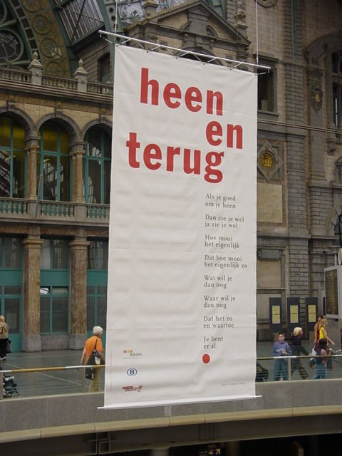 © Nanne Nauta, 2004 TOVENARIJ TEISTERT DE WERELD Hanoi/Dar es Salaam/Johannesburg (Reuters) - Twee mislukte gevallen van tovenarij kwamen vandaag in het licht: in Vietnam had een tovenaar de ouders van een 17-jarige overleden jongen wijsgemaakt dat ze hun zoon levend hadden begraven. Ze groeven hem op en bewaarden hem 36 jaar in een glazen kist. Merkwaardig genoeg berichtte de Ho Chi Minh City Police Newspaper dat zijn stoffelijk restant al die tijd niet vergaan was. In Tanzania daarentegen verliep een ingreep van een tovenaar heel wat rampzaliger. Van vier booswichten die een tovenaar gevraagd hadden hun lichamen onkwetsbaar te maken voor kogels en messteken overleefde één de toverbehandeling niet. De drie anderen belandden via het ziekenhuis in de bajes. En de tovenaar? Die is op z'n vliegend tapijt opgestegen en in noordelijke richting verdwenen. En tot slot heeft in Zuid-Afrika een magistraat toestemming gegeven voor het begraven van een al zeven weken geleden overleden man. Een 'profeet' had zijn familie wijsgemaakt dat de dode binnenkort zou opstaan uit de dood. De nabestaanden hadden hem in afwachting van zijn opstanding gestald in een mortuarium. Toen zijn herrijzenis te lang op zich liet wachten stuurde het mortuarium het lijk retour afzender. Daar verbleef het enige tijd, totdat justie het lijk naar een ander mortuiarium verordonneerde. In Zuid-Afrika schijnt deze kwestie wekenlang de kranten beheerst te hebben, en werden meerdere data voor de opstanding genoemd. Kortom: genoeg inspirerend materiaal voor wat verse VVP-poëmen! (Rottend Staal Online, 24-8-2004) terug naar boven UIT HET TOTAAL POËZIEFESTIVAL Groningen - Het Oude R.K.Z., oftewel het Oude Rooms Katholieke Ziekenhuis in Groningen werd 25 jaar geleden gekraakt. Hoewel het gebouw al jaren geleden na legalisering de kraakstatus verloor is het nog steeds de woonplaats van honderden mensen en een van de broeiplaatsen van de Groninger undergroundcultuur. Het 25-jarig jubileum wordt ondermeer gevierd met het Uit het totaal-poëziefestival, dat vrijdag 27 augustus gehouden wordt. In de bioscoopzaal treden dichters met beeld en/of geluid op en in het café vinden droge voordrachten plaats. Typisch Gronings is dat de entree gratis is en de aanvang 21.00 uur bedraagt. Met o.a. Robin Block, Piet Oosterheerd, Meindert Talma, Tsead Bruinja, Daniël Dee, De Dichters van het Convenant, Ton Peters, Ariën Siertsema, De Dichters uit Epibreren, Stefan Nieuwenhuis, Sieger Baljon en de RaaskalBomFukkerz, Anneke Claus, Joost Stockx, en Guido van der Wolk. (Rottend Staal Online, 24-8-2004) terug naar boven LOWLANDS - DE ZONDAG Epibreren - Het Lowlandsverslag dat gisteren gepubliceerd werd is aangevuld met observaties van Tjitske Jansen. Door een brand in de drukkerij haalden gisteren die details het artikel niet. Even herlezen, dus. (Rottend Staal Online, 24-8-2004) terug naar boven HOE JAN KLUG OMGAAT MET KRITIEK Epibreren - Technisch hoofdredacteur Jan Klug heeft cinematografisch vastgelegd hoe hij met kritiek omgaat. Dat ging gepaard met de verdwijning van onze nieuwe stagiaire Elisabetta Spallaccia. (Rottend Staal Online, 24-8-2004) terug naar boven BRIESENDE DICHTER IN DE AANVAL Epibreren - Het meetcentrum registreerde juist een nieuwe link naar het eiland, die een aanval op achtereenvolgens Komrij, Vinkenoog, de Vijftigers, Rottend Staal, Pfeijffer, Zwagerman, De Dichters uit Epibreren, weer Rottend Staal en tot slot Krakatau bevat. De aanvaller is Bart Brey (1955), ex-Maximaal en auteur van de dichtbundels Bodemzin (In de Knipscheer, Haarlem, 1987), Ademsprong (In de Knipscheer, Amsterdam, 1993), Vers van het vuur (Voetnoot, Amsterdam, 1996) en Lichtzang (Voetnoot, 2001). En hij heeft natuurlijk helemaal gelijk met z'n aanval. Al is het hem ontgaan dat we als eilanders zeer behoudend zijn en regelmatig uitroepen dat vroeger alles beter was, waarmee zijn beschuldigingen dat we 'vernieuwend' zouden claimen te zijn toch een beetje in het luchtledige blijven hangen. (Rottend Staal Online, 23-8-2004) terug naar boven DRS. P IN NOVA Hilversum - Morgen wordt H.H. Polzer alias Drs. P 85. Reden voor het tv-programma Nova om hem vanavond te feliciteren en zijn oeuvre uitgebreid met hem door te nemen. De uitzending is vanaf morgenochtend online te bekijken. Vanavond, Nederland 3, 22.20 - 23.00 uur (Rottend Staal Online, 23-8-2004) terug naar boven HOFMAN OPGEHANGEN IN STATION Antwerpen - Afgelopen vrijdag 20 augustus 2004 is in het kader van Antwerp World Book Capital 2004 het gedicht 'Heen en terug' van Tjitse Hofman onthuld in het Centraal Station van Antwerpen. Het doek meet 2,5 bij 5 meter en is dubbelzijdig bedrukt, zodat zowel de reizigers die heen alsmede de reislustigen die terug gaan het niet snel zal ontgaan. Het blijft in ieder geval hangen tot en met 21 september. Wat er daarna mee gebeurt is nog een raadsel. Liesbeth van Dalsum reisde af naar Antwerpen en maakte daar voor de minder mobiele medemens het volgende kiekje: © Liesbeth van Dalsum, 2004 (Rottend Staal Online, 23-8-2004) terug naar boven TUINBESLOMMERINGEN Tuindorp - Jacob Griephonger signaleerde onze medewerker