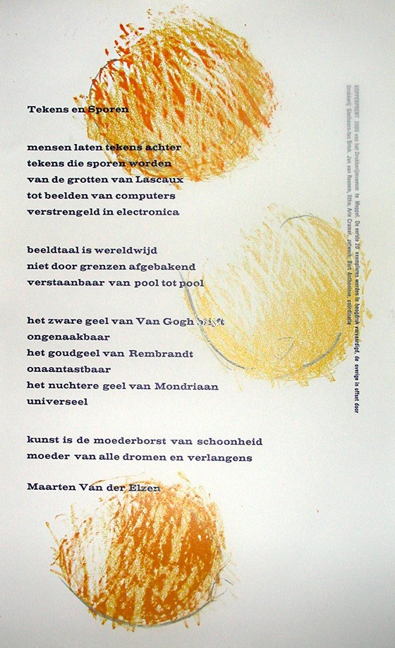 moeder. DE KOMENDE GEDICHTENDAG DE DDV-SOAP: POETRY GAAT EXACTE UITSLAG BEKENDMAKEN Max Dohle spreekt blubber Epibreren - Bij een persconferentie van Poetry International en de NPS, vanmiddag in Amsterdam, deed Poetry-directeur Bas Kwakman de toezegging dat in ieder geval het aantal stemmers op de vijf populairste dichters in de DdV-verkiezing geopenbaard zal worden. En op aanvraag zullen ook nadere stemgegevens geopenbaard worden. Tot dusverre zijn 5000 stemmen geldige stemmen gecontroleerd en geregistreerd en moet nog een onbekende hoeveelheid geteld worden. Over die persconferentie later vandaag meer. De eerdere aankondiging betreffende Max Dohle's onthulling blijkt gebakken lucht te zijn - mijn excuses voor de overlast (Bart FM Droog, Rottend Staal Online, 19-1-2005) VANAVOND BEKENDMAKING NIEUWE DDV? Amsterdam/Epibreren - Max Dohle bericht ons dat hij vanavond op het Communicatielog bekend zal maken wie de nieuwe Dichter des Vaderlands wordt. We zijn erg benieuwd naar zijn onthulling, maar weten niet hoe we deze vooralsnog moeten inschatten. Dohle beschikt evenwel over goede contacten binnen het PCM-concern, eigenaar van o.a. NRC Handelsblad. Wegens on-the-road-verplichtingen zal minimaal tot vanavond de nieuwsvoorziening vanaf Epibreren gestaakt worden. .(Rottend Staal Online, 18-1-2005) POËZIE IN DE VARAGIDS Epibreren/Hilversum - In de Vara- en VPRO-Gidsen die deze week verschijnen veel aandacht voor de DdV-Soap: in de Vara-Gids interviews met Hagar Peeters, Driek van Wissen en Elly de Waard over het DdVschap, hun campagnes, en alledrie schreven een vers vers voor de gids. En onze medewerkers Starik en Tuinman worden geïnterviewd over hun televisiekijkgedrag. In de VPRO-Gids staat naar verwachting een diepte-interview met onze hoofdredacteur over de soap. .(Rottend Staal Online, 18-1-2005) SIGNEERMACHINES Epibreren - Onlangs kwam een signeermachine in het nieuws, omdat de Amerikaanse minister van defensie Rumsfeld zo'n apparaat had ingezet om de condoleancebrieven aan familieleden van gesneuvelde soldaten mee te ondertekenen. De Canadese schrijfster Margaret Atwood wil nu ook zo'n ding. Reden voor de Gelderlander om een aantal Nederlandse auteurs, waaronder H.H. ter Balkt, te vragen hoe ze over signeren denken. .(Rottend Staal Online, 18-1-2005) DRENTSE KOPPERMAANDAGPRENT Assen/Meppel - Het is nu precies een week geleden dat in het Drukkerijmuseum te Meppel de Drentse koppermaandagprent (klik rechtsonder op plaatje om het leesbaar te krijgen) uitgereikt aan Maarten van den Elzen, dichter en uitgever uit Uden. Zijn gedicht 'Tekens en sporen' (uit: Zwaluwen en een zuiver hart, Hoenderbossche Verzen, Uden, 1997) werd door kunstenaar Jan van Rossum uit Steenwijk vormgegeven, m.b.v. steendruk. De prent is in een offsetuitvoering te koop bij het Drukkerijmuseum. .(Rottend Staal Online, 17-1-2005) DE NIEUWE STADSDICHTER VAN GRONINGEN Groningen/Epibreren - Het is natuurlijk erg aardig dat het Dagblad van het Noorden in de aanloop van de benoeming van de inderdaad derde Stadsdichter van Groningen, zoals onze medewerker Guido van der Wolk op zijn weblog opmerkte, een tiental van de kandidaten presenteert. Minder aardig is het dat de stadsredactie van die krant dit onzalige idee heeft opgevat: 'Aan het eind van de reeks vellen de lezers een oordeel en mag u een winnaar aanwijzen. Wie weet legt het gewicht in de schaal bij de vakjury die een kandidaat moet aandragen bij het college.' Omdat er nu eenmaal 31 kandidaten zijn, waarvan het DvhN maar 10 presenteert, slaat de in de alinea hierboven aangekondigde lezersverkiezing nergens op. De 'vakjury' heeft al begin januari een oordeel geveld. Toch is er ook een positieve kant aan dit verhaal: het gewauwel van sommige van de kandidaten, kritiekloos neergepend door stadsredacteuren zonder enige poëziekennis, toont het belang aan van het bestaan van de kunstredactie van het DvhN. .(Rottend Staal Online, 17-1-2005) NIEUWE RECENSIE OP POËZIERAPPORT Wevelgem - Nieuw op de poëzierecensiesite Poëzierapport: Paniek in het circus van onze medewerker Frederik Lucien de Laere, besproken door Patricia Lasoen. Die eindelijk eens revanche neemt op al die mannelijke recensenten die het hebben over het uiterlijk van dichteressen: 'Hier mag overigens gezegd dat hij er uitziet als een echte dichter en mooie ogen heeft. Niet alleen mannen mogen met complimentjes gooien.' (Rottend Staal Online, 16-1-2005) JÜRG HALTER: IK STOP MET POETRY SLAM Stuttgart/Bern/Epibreren - Per ietwat vertraagde post bereikte ons vandaag het nieuws dat onze medewerker Jürg Halter gestopt is met optredens bij Poetry Slams. Hij verklaarde dit in november bij de achtste German International Poetry Slam GILP te Stuttgart (Rottend Staal Online, 16-1-2005) DE WINTER IN DRIE GEZANGEN Amsterdam - Max Dohle presenteert 'De winter in drie gezangen', een 18de eeuwse boertige klucht over de Friese schaatscultuur. De productie is nog aan verandering onderhavig, maar is voor liefhebbers van schaats- en ijspoëzie beslist de moeite van het bezoeken waard. (Rottend Staal Online, 16-1-2005) PERSCONFERENTIE OP LIEFDESEILAND Epibreren - Om 16.00 vanmiddag geven onze sterverslaggeefster Liesbeth van Dalsum en onze hoofdredacteur Bart FM Droog een persconferentie, live vanaf het liefdeseiland waar ze gisteren naar vertrokken zijn. Waarover die persconferentie gaat is tot dusverre angstvallig geheim gehouden. (Jacob Griephonger, Rottend Staal Online, 15-1-2005) DANIËL DEE: 'IK WORD GEEN STADSDICHTER' Groningen - Op zijn weblog bericht onze medewerker Daniël Dee dat hij grote zekerheid heeft dat hij niet de volgende Stadsdichter van Groningen wordt. Best wel jammer, want in een interview met het Dagblad van het Noorden vertelde hij over sympathiek klinkende projecten die hij als Stadsdichter zou willen ondernemen. (Rottend Staal Online, 15-1-2005) ONTSPOORDE DICHTERS IN WEST-VLAANDEREN Harelbeke/Epibreren - Nadat het verschijnsel zich al eerder in Groningen en Friesland voordeed - waarbij één arrestat